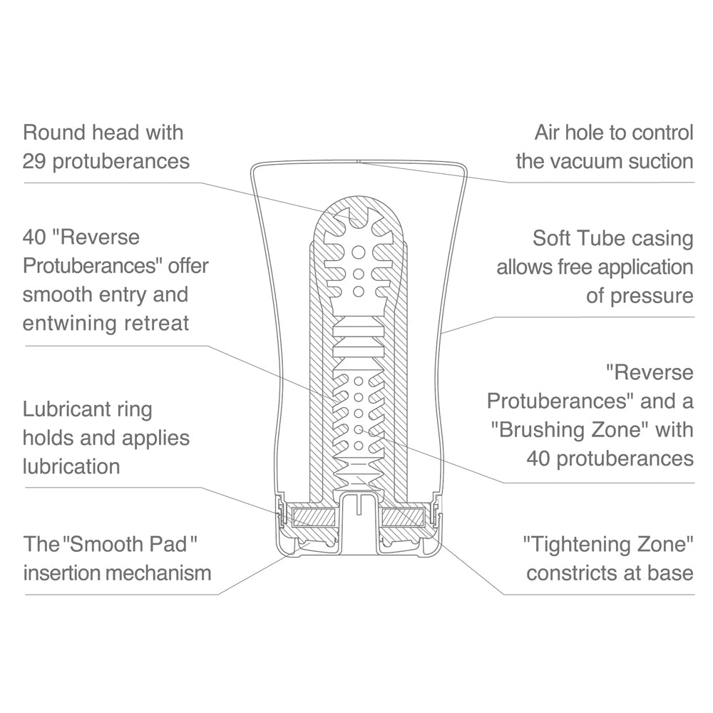 The Tenga Cups all feature the Smooth Pad insertion mechanism. This mechanism not only offers extra adherence, air-tightness, and less lubricant leakage, but will automatically apply lubricant to the shaft as you insert, thanks to the included Lubricant Ring. To enhance the experience, remove the 'cover hole' sticker placed on the Air Hole of the Tenga Cups before use. Additionally, you can control the vacuum suction of the Cup if you cover the